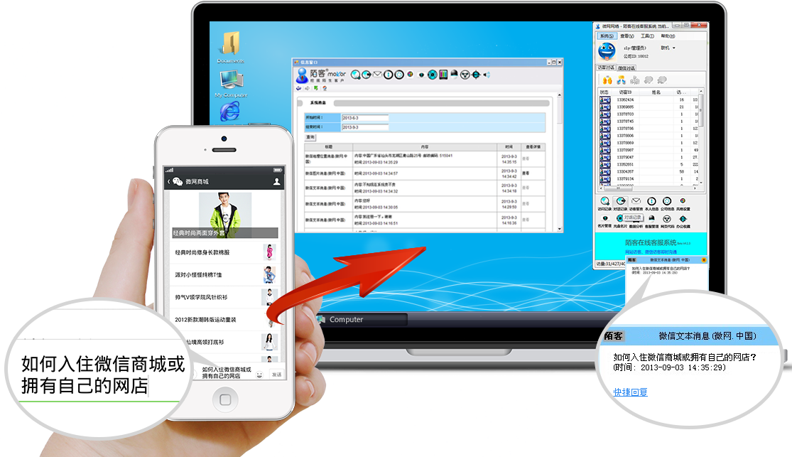 陌客mokor在微信商城中,只要訪客在公眾號中輸入信息,即可在陌客客戶端軟件即時提醒,可以快速回復,回復直接在公眾號中顯示。這樣,公眾號可以即時與陌客端即時對話交流。